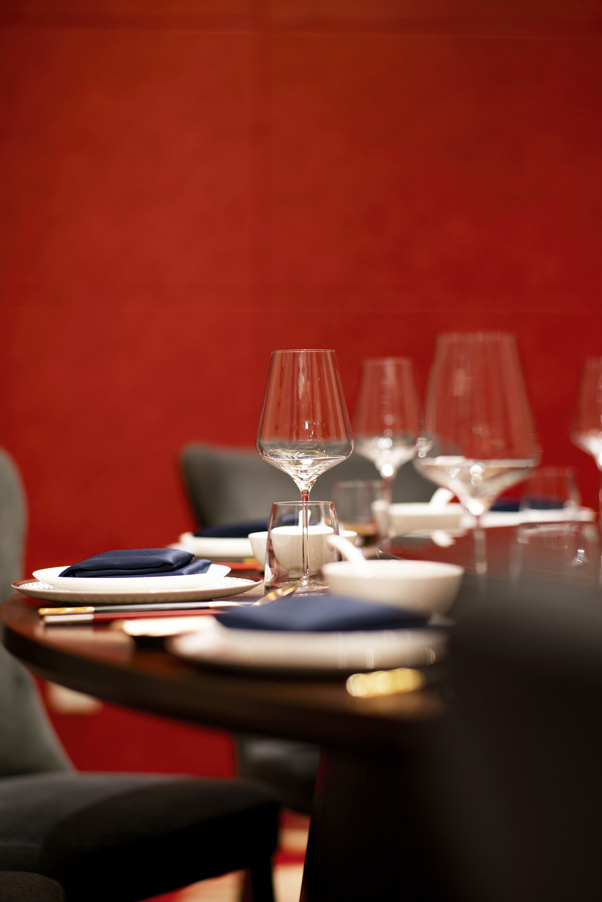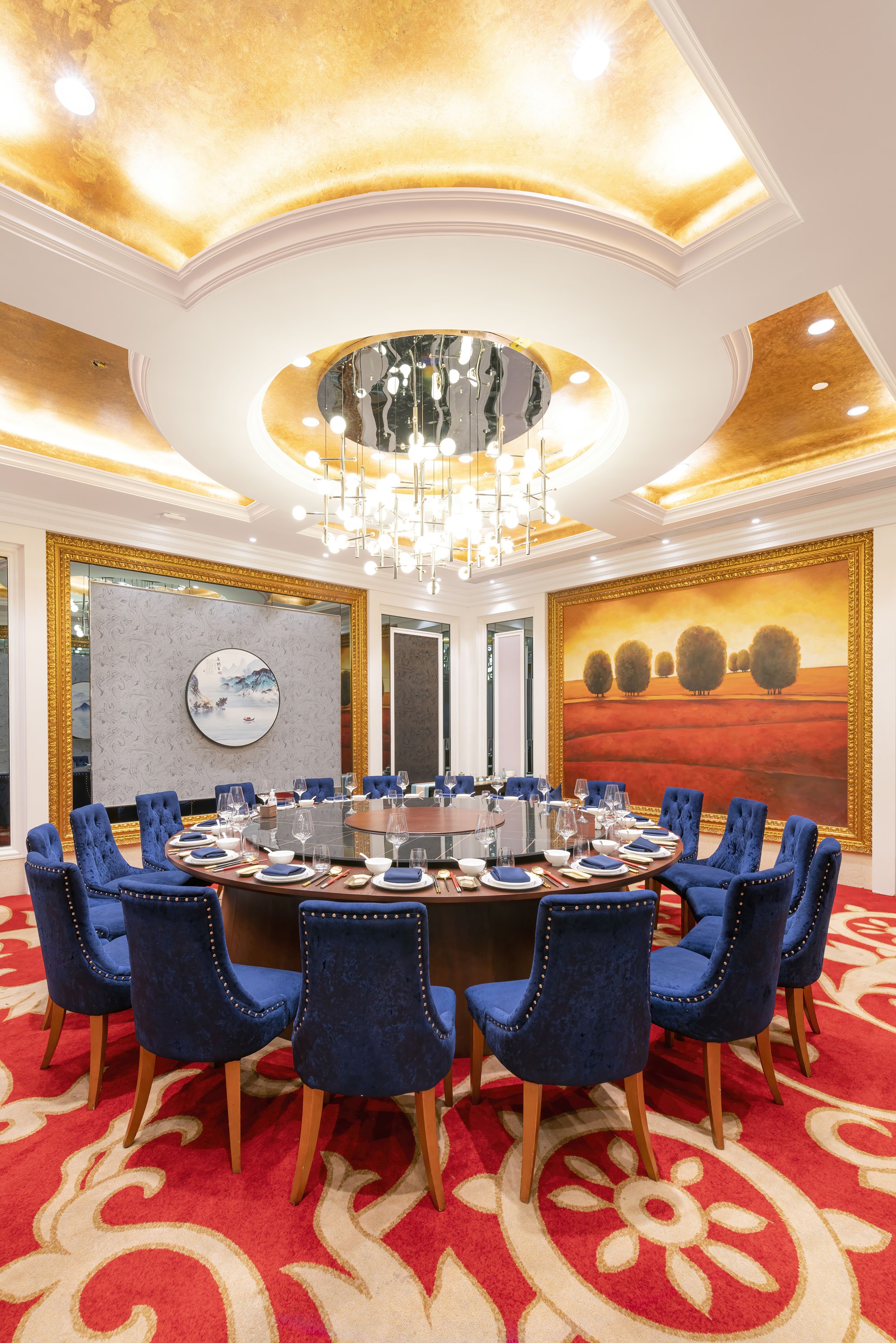 包厢融合沉静内敛的灰蓝色与热烈的绯红,华丽而不失雅致。配以简约新中式的茶台,觥筹交错后,品一茗香茶,岂不美哉?