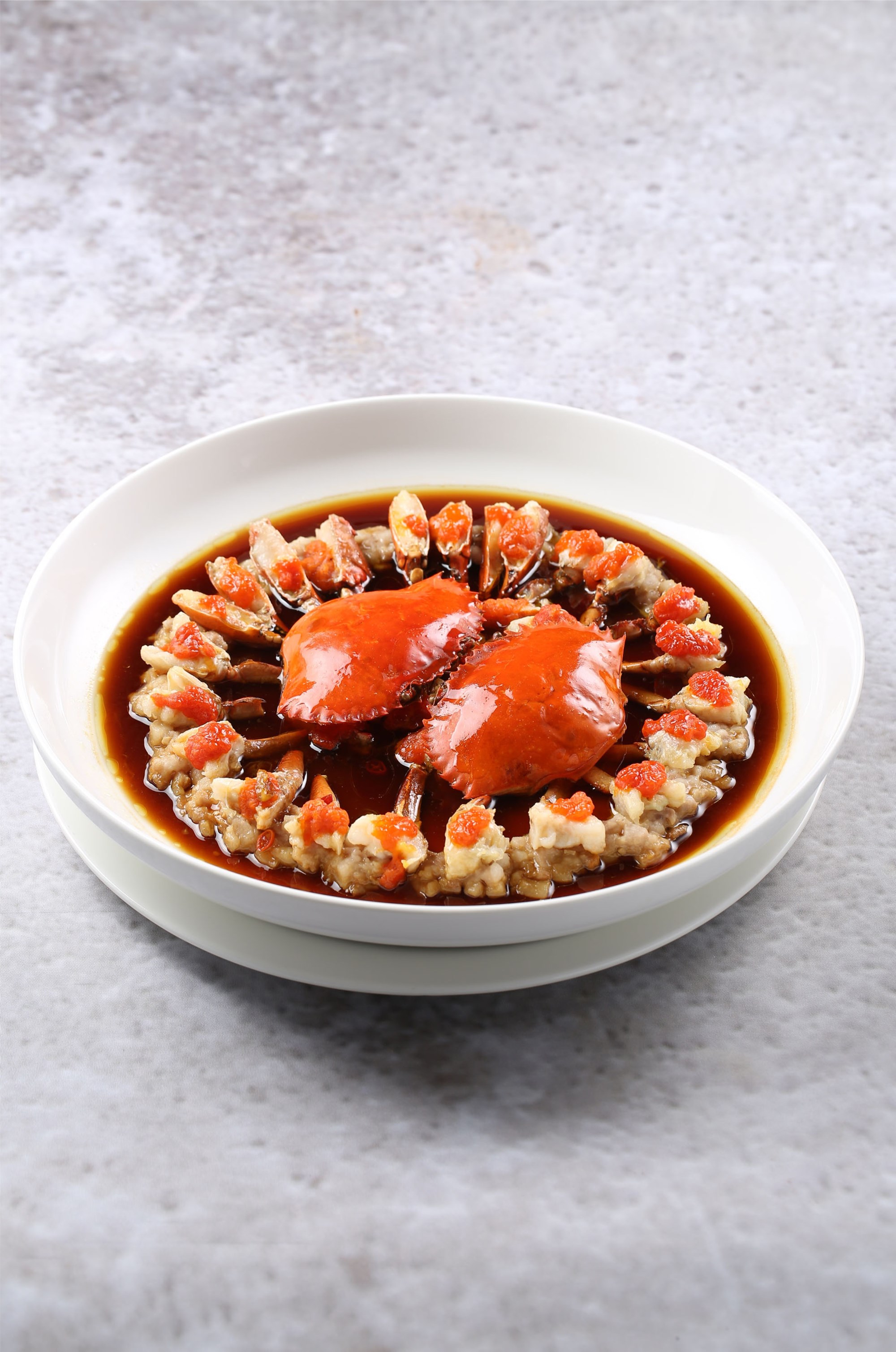 产自浙江的三门青蟹,配上肉糜一起蒸制后,蟹吸收了肉的香,肉也染上了蟹的鲜。再淋上一层酱汁,激发蟹的香味。