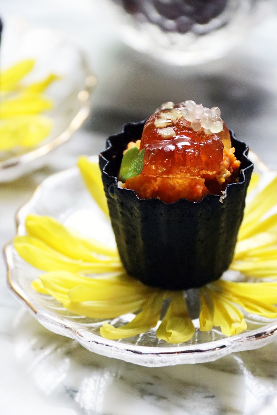 《浮生六记》卷二“闲情记趣”中记载了芸娘爱吃腐乳,沈复本来无法接受腐乳的味道,却因芸娘的影响而爱上了它的味道。这道咸点将腐乳与鹅肝融合,再用秋季时令水果山楂替代白糖,达成了酸、甜、咸三种口味的平衡。