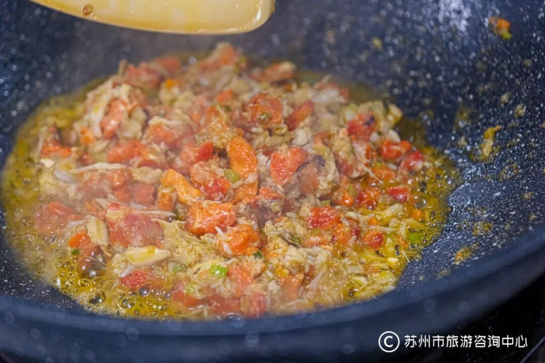 灶火燃起,便是鲜味凝聚的魔法时刻。一勺晶亮的荤油滑入铁锅,随之投入姜末爆香。当那盘金红相间的蟹粉倾入热锅的瞬间,“滋啦”一声,腾起一股浓郁的蟹香。在快速颠炒中,蟹黄如碎金,蟹膏似凝脂,蟹肉似银丝,彼此交融,浑然一体,成为浓缩了整个秋天精华的至鲜之物。