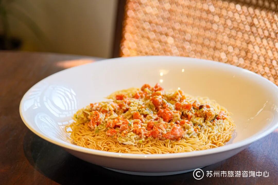 在苏式面点中,蟹粉两面黄堪称一道极具辨识度的佳品。它不像寻常汤面那般温润,独以酥脆口感和富丽色泽自成一家,再搭配丰腴的蟹粉,可谓是金秋时节最令人期待的味觉献礼。