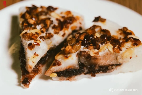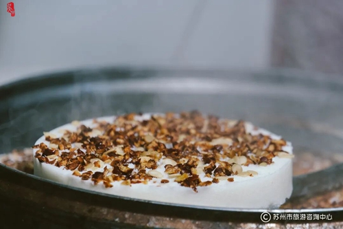 在苏州东山,每到腊月,家家户户都“热气腾腾”,忙着制作猪油糕。蒸好的猪油糕洁白晶莹,咬上一口,糯软润湿,油而不腻,两层米粉之间还流淌着厚厚的一层豆沙馅,又香又甜。春节前夕,不少老苏州都会专程前来购买。年夜饭的餐桌上,有猪油糕当饭后点心,增色又增味,还能讨一个团圆的好口彩。