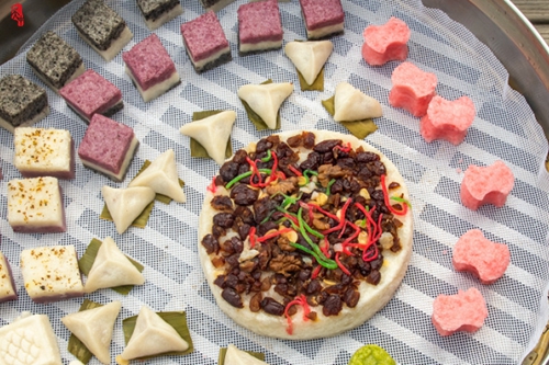 吴中的年,总是从一口软糯的糕团开始。它们不仅是点心,更是寓意团圆、高升、吉祥的味觉符号。定胜糕色泽淡红,松软香糯;猪油糕油润晶莹,糯而不腻;枣香雪饺形如弯月,一口咬下,软糯的酥皮裹着细腻枣泥,甜香悠长;白玉方糕洁白如玉,内嵌一团细腻温婉的豆沙馅,甜度恰到好处,是岁月沉淀出的朴实香甜;稳笃丁和定胜糕圆润软糯的造型里,包裹着家家户户“稳稳当当”“得胜圆满”的朴素祈愿。若要寻一份绚烂的喜庆,别忘了光福的五彩团。用南瓜、紫薯、青菜等天然植物染出缤纷色彩,再包入五种不同的馅料。它不仅是视觉的欢愉,更是一口咬下,多种口感与风味在舌尖层层绽放的年节佳品。