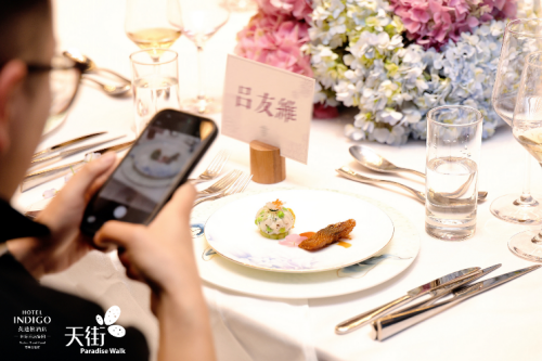 晚间,一场以 “春叙” 为主题的春季品鉴晚宴在酒店45层宴会厅优雅开席。晚宴以春为叙,将荠菜鮰鱼狮子头、香煎西冷芦笋、樱花渍北极甜虾等春季时令风味融入菜单,让来宾在舌尖之上感受姑苏的春天。酒店总厨Bob Liu与中餐主厨Henry Zhu亲临现场,与来宾分享菜品背后的创作故事。晚宴期间,酒店经理Kathy Feng更以手绘绣球花菜单作为“彩蛋”,为来宾带来专属的邻间温度。